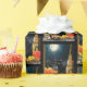 Un chat noir est assis dans une porte avec des citrouilles, plus tard, le bâton de brosse, les feuilles d'automne et une pleine lune de récolte derrière.