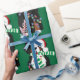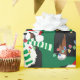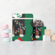 Festive Personnalisé Noël Vacances Bernese Mountain Dog habillé en chapeau de santa et écharpe verte et blanche décorée de lumières de Noël. Joli emballage cadeau de noël pour les amoureux de berner!