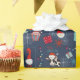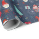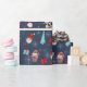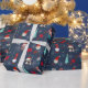 Add your family name and celebration date to wrapping paper with whimsical holiday design featuring Santa cupcakes, snowmen, gift boxes, string lights, and snowflakes on a dark blue background.