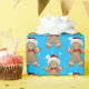 Cute gingerbread man cookie with Santa Claus cap and snowflake overlay on an aqua background.