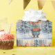 A charming mouse dressed in a cozy blue winter coat, proudly displaying a "Merry Christmas" sign amidst a picturesque snowy forest where delicate snowflakes gently fall
