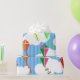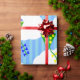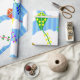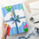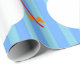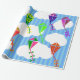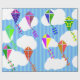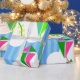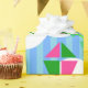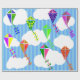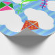 Ce papier d'emballage a un design géométrique de cerfs-volants volant dans les nuages d'un ciel rayé bleu. Il est très coloré et festif.