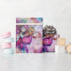 Coloré, fantaisiste, drôle clown rose jouant de la trompette avec un hibou expressif et des notes musicales joyeuses, fleurs, feuilles dans des couleurs rouge vif, fuchsia, violet, pourpre, bleu, blanc, peinture à l'aquarelle par Bulgan Lumini (c)