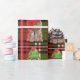 Un Cockapou marron mignon est assis avec une écharpe rouge d'hiver mignonne et un casquette d'hiver vert contre un arrière - plan à motifs plaid rouge et vert, prêt à souhaiter à tout amoureux des chiens ou à tout amoureux un séjour heureux.