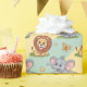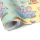 Colorful animal-themed wrapping paper with a playful pattern of cartoon lions, elephants, and zebras against a pastel yellow and blue background.