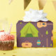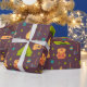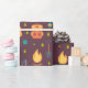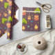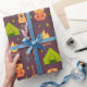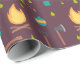 Envelopper le papier avec un motif amusant sur le thème du camping. Placer sur un arrière - plan brun rougeâtre. Les éléments du motif comprennent un feu de camp, une tente, une guitare, une pelle et un sac à dos.