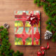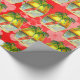 Bonnes fêtes des plages sablonneuses chaudes de votre plage tropicale préférée d'île. Palmier décoré des ornements et des lumières de Noël, avec une rétro planche de surf se penchant contre l'arbre de Noël dans l'avant un coucher du soleil au-dessus de l'océan. L'arrière - plan rouge de couleur de vacances des tortues et de la ketmie de mer hawaïennes de Honu fleurit.
