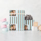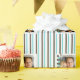 Un motif à rayures verticales dans les tons bleu aqua et marron chocolat forme un arrière - plan au texte et aux modèles photo qui peuvent être personnalisés pour votre occasion spéciale. PHOTO - Remplacez-la par celle du couple nuptial, ami proche, membre de la famille ou collègue de travail. MOT - Customisez-le.