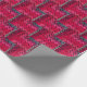 A vibrant crocheted pattern showcases a blend of pink, red, and purple colors, forming a visually striking geometric design