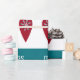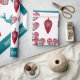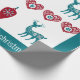 Papier d'emballage moderne et artistique de Noël avec un motif scandinave / nordique qui comprend des coeurs rouges (avec des feuilles et des fleurs) en forme de croix nordique (comme on peut le voir sur les drapeaux du Danemark, de Finlande, d'Islande, de Suède, de Norvège, etc.), des billes rouges (avec un design de flocon de neige), des rennes turquoise, et le texte personnalisable "joyeux noël."