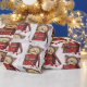 Wrapping paper with a cute drawing of a little kitten poking its head out of a gift box.