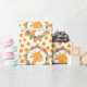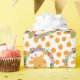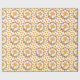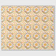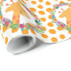 Papier enveloppant avec l'illustration d'un joli visage souriant de girafe, entouré d'une couronne de fleurs d'aquarelle tropicale. Coloré et mignon. Arrière - plan est un motif avec des taches oranges.