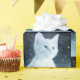 Papier enveloppant avec une adorable photo d'un chaton blanc aux cheveux courts aux yeux bleu vif. En partant au loin. Des pattes croisées à la mode chatte typique.