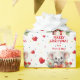 Le motif mignon sur ce papier d'emballage de Noël est d'un adorable petit ours de koala gris. L'ours sort d'un paquet cadeau de Noël décoré d'un arc rouge et de baies rouges. Entre les images d'ours est votre texte personnalisé en rouge. Tout est placé sur un arrière - plan de confettis rond multicolore qui est parsemé de coeurs rouges et de quelques étoiles dorées. C'est un papier parfait pour les grands-parents, les parents, les tantes et les oncles pour envelopper les cadeaux de famille. Assurez-vous de voir les étiquettes cadeaux et autres produits correspondants dans notre magasin.
