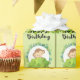 Envelopper le papier avec un motif extensible adorable. Illustration de dessin d'un petit singe qui regarde derrière un buisson vert dans un carré vert d'olive. Entouré d'une couronne de feuilles tropicaux. Une bannière de feuilles tropicaux s'étend également sur le sommet de chaque carré. Joyeux anniversaire écrit dans une police tendance. Situé sur un arrière - plan d'aquarelle vert olive.