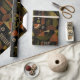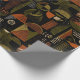 Sophisticated mid-century geometric pattern wrapping paper featuring layered circles, arches, triangles, and rectangles in forest green, burnt orange, ochre, and cream on a black background. Rich textures and retro-modern shapes create a bold design ideal for Bauhaus lovers, vintage décor fans, and anyone drawn to moody modern style.