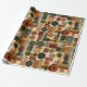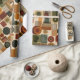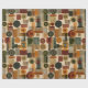 Sophisticated mid-century geometric pattern wrapping paper featuring layered circles, arches, triangles, and rectangles in forest green, burnt orange, ochre, and cream on a black background. Rich textures and retro-modern shapes create a bold design ideal for Bauhaus lovers, vintage décor fans, and anyone drawn to moody modern style.