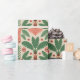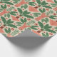 Decorative paper with a pattern of stylized green leaves and pink flowers on a white background, shown rolled and flat. Bright and lively design.