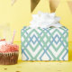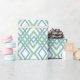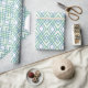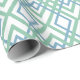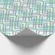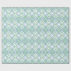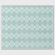 Ce papier d'emballage a un design art déco de diamants qui se chevauchent dans verditer (vert) et bleu sur un champ de blanc.