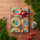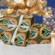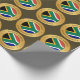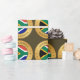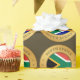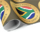 Le drapeau sud-africain est encastré dans une bague en faux or arrondie. Les mots "Afrique du Sud" se trouvent en haut et en bas du design, et ont un effet pressé. La paire de trois étoiles décoratives les unes en face des autres, est également conçue avec un effet pressé.