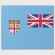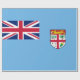 Ce dessin présente le drapeau national de Fidji (officiellement connu sous le nom de République de Fidji), un pays insulaire de Mélanésie, partie de l'Océanie dans l'océan Pacifique Sud. Le pays se trouve à environ 2 000 km au nord-est de la Nouvelle-Zélande. Fidji se compose d'un archipel de plus de 330 îles, dont environ 110 sont habitées en permanence, et de plus de 500 îlots, soit un total d'un peu plus de 10 000 km de carré. Le groupe insulaire le plus excentré est Ono-i-Lau. La grande majorité de la population fidjienne vit sur les deux principales îles, Viti Levu et Vanua Levu. Près des trois quarts des Fidjiens vivent sur les côtes de Viti Levu : dans la capitale Suva ou dans des centres urbains plus petits comme Nadi, où le tourisme est la principale industrie locale, ou à Lautoka, où l'industrie de la canne à sucre domine. L'intérieur de Viti Levu est peu habité.