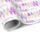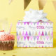 Emballage d'anniversaire style drapeau triangulaire motif enveloppé idéal pour les anniversaires de filles ou d'autres occasions. Personnalisez avec votre propre âge d'anniversaire et des lettres pour votre nom sur le bunting actuellement lit Dorothy Happy 65th Birthday. Papier enveloppant dans des tons pastel rose, violet, doré et bleu sur le blanc. Conçu par Sarah Trett.