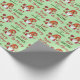 Sur ce papier d'emballage festif Holiday est un elfe de gnome mignon habillé d'un chapeau de Père Noël motif de rennes rouge et or. Il tient un verre de vin du Père Noël d'une main, et un sucre de canne rayé rouge et blanc de l'autre. Le texte rouge et vert en gras dit "MANGER BOIRE BE MERRY". Votre texte personnalisé est en vert et rouge correspondant à un côté.