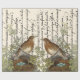 Ce dessin présente l'illustration détaillée d'un oiseau à grives gardant son nid rempli d'oeufs bleus cachés dans la végétation. Juste derrière l'oiseau se trouve un beau poème français écrit en écriture élégante avec de nombreuses fleurs contre un arrière - plan en ivoire pâle.