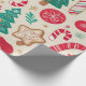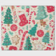 Ce motif en papier d'emballage de Noël présente des éléments de vacances classiques tels que les arbres de Noël, les sucres de canne, les flocons de neige, les biscuits en pain d'épice et les ornements. Elle est remplie de rouge, de vert, d'or et de blanc, sertie contre un arrière - plan beige clair et chaleureux, créant une ambiance festive et cosy. Ce papier est parfait pour envelopper les cadeaux.