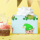 Un petit elfe vert mignon avec une casserole d'or sur papier cadeau bleu clair.