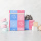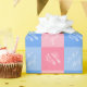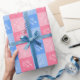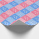 Un mignon sexe rose et bleu révèle des papiers d'emballage de fête avec des empreintes de nouveau-né bébé. Personnalisez ce cadeau de baby shower en ajoutant un nom de bébé garçon ou fille dans les zones de texte personnalisées qui disent : Est-ce un garçon ? ou est-ce une fille ?