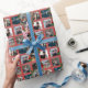 Rouge doublé, enveloppement cadeau de Noël avec 9 photos ! Mistletoe, arbres de Noël et ampoules de Noël. La photo centrale est la plus grande et est entourée d'un cadre bleu. C'est un regard vraiment chaud. Motif répète avec les 9 photos. Utilisez l'invite de personnalisation pour télécharger. Amour ! Conception par HAMbyWhiteGlove aka HAMbyWG