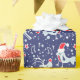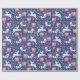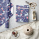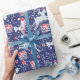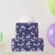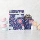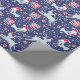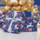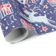 De mignons oiseaux chanteurs avec des cerfs dansants sautant au-dessus de cadeaux de Noël avec des notes musicales, de la neige et des étoiles, du papier cadeau de Noël à motifs graphiques dans des tons patriotiques de bleu foncé, rouge et blanc.