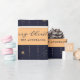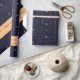 Papier enveloppant avec un arrière - plan de papier peint rayé bleu foncé et or avec un script élégant et une police serif dans laquelle vos informations personnalisées sont écrites. Consultez notre magasin pour plus d'articles de cette collection.