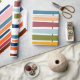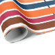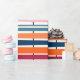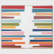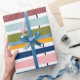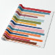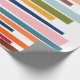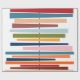 Ce papier d'emballage a un design moderne du milieu du siècle de lignes horizontales de couleur sur une ligne verticale noire avec des cercles.