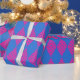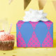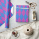 Un rouleau chic de papier d'emballage, avec un motif imitation patchwork de formes diamant, un bleu clair, des points bleus sur un arrière - plan Magenta.