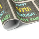 Cette conception amusante de papier d'emballage sur le thème de l'anniversaire comporte un message comme "HAPPY 97th BANTHDAY, FIRST-NAME!", où le nom peut être personnalisé. L'arrière - plan présente un motif rustique, brun, imitation bois de grain. Le texte du message personnalisable est composé de couleurs comme le bleu, le jaune et le vert, et il a un aspect inspiré de celui du lettrage peint et recouvert de pochoirs. Un papier comme celui-ci pourrait peut-être être utilisé pour envelopper les cadeaux d'anniversaire donnés à quelqu'un qui célèbre son quatre-vingt-dix-septième anniversaire. [~Z0000293]