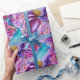 Fée des fleurs vibrante et colorée, tourbillons floraux et plante papillon magique, peinture à l'aquarelle contemporaine en violet, violet, rose, fuchsia, bleu-vert couleurs iridescentes dorées et argentées par Bulgan Lumini (c)