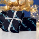 Feliz Navidad (Espagnol - Joyeux Noël) apparaît en bleu et blanc brillant sur un arrière - plan starfield.