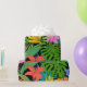 Les feuilles tropicaux verts et bleus se mêlent aux fleurs de lavande, jaunes, rouges et oranges dans ce décor exotique.