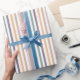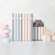 Papier d'emballage rayé large et multicolore, aux tons doux de beige, bleu, vert et blanc. Un motif aux rayures variées et modernes, aux couleurs pastel de la plage.