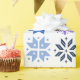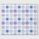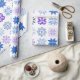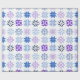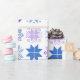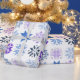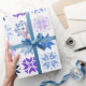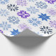 Ce papier d'emballage a une conception hivernale de différents flocons de neige dans le blues et les violets dans les rangées.