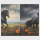Un hippocampe friésien noir saisissant au milieu de fleurs sauvages vibrants, avec un ciel orageux spectaculaire en arrière-plan, ajoutant un sens de puissance et d'élégance.