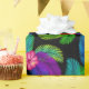 Col tropical avec des fleurs d'hibiscus roses et rouges, feuilles de palmier. Style hawaïen sombre sur fond noir.