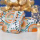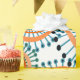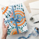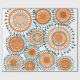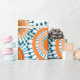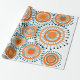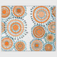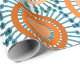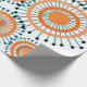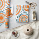 Ce papier d'emballage a un design d'anneaux et de cercles dans les tons orange avec des lignes turquoises qui traversent derrière eux formant des fleurs sur un champ de blanc.
