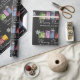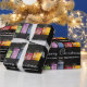Ajoutez une touche spéciale à votre cadeau avec du papier d'emballage personnalisé. Des cadeaux colorés avec le message "Joyeux Noël", ajoutez le nom de votre famille.