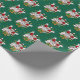 A funny snowman cartoon on Christmas wrapping paper. It's maximum Christmas with this excited snowman dressed up as Santa Claus, jumping out of a Christmas present like a jack-in-the-box. The surprise gift is wrapped in gold paisley wrapping paper and a green ribbon with white snowflakes.