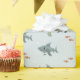 Ce papier d'emballage anniversaire de enfant, mignon et moderne, est décoré d'un motif sous le requin de mer, avec un requin, un poisson et des algues. Le parfait emballage sur le thème de la mer pour votre anniversaire de enfant.