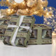 Papier d'emballage d'anniversaire avec un gâteau d'anniversaire au chocolat Frankenstein Head avec "Happy Birthday", police en gras casquette. Customisez-le en ajoutant votre ou vos nom(s).