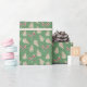 Cet emballage cadeau de Noël est composé d'un motif de gâteaux de collation aux arbres blancs de Noël, de crocs de menthe poivrée rayée rouge et blanche, et de petites étoiles rouges contre un arrière - plan vert mousse.